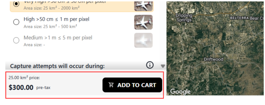 - Once submitted, the task will be sent via API to the satellite for image capture